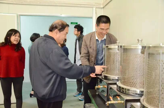 ▲四川省中醫(yī)藥科學院中藥研究所徐超群所長、中國科學院成都生物研究所丁立生研究員、王鋒鵬教授參觀固體制劑中心