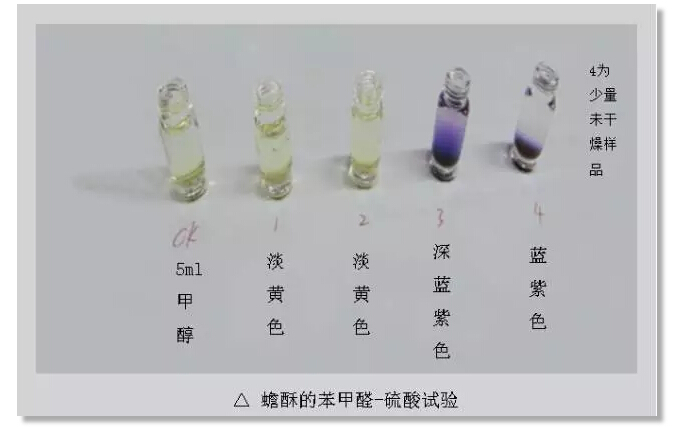 按傳統(tǒng)蟾酥鑒別法,若遇水起泡沫則是蟾酥正品,則可初步推斷樣品2是偽品,樣品1、3疑似正品,為了進一步證明推斷是否正確,來試試顯色法。
