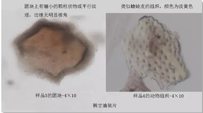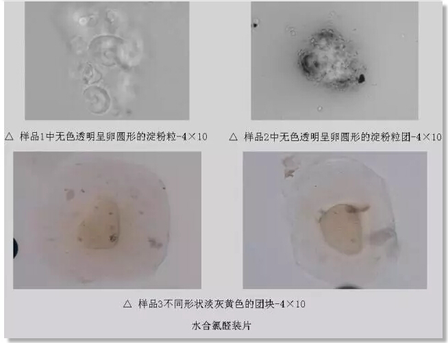 與在樣品4中發(fā)現(xiàn)的動物組織相比,更令我驚訝的是在樣品1、2中發(fā)現(xiàn)了淀粉顆粒,不過這無色透明呈卵圓形的淀粉??粗€蠻晶瑩剔透的,只是可惜了都是偽品吶,要知道蟾酥很貴的好不,不要什么淀粉、泥砂、牙膏、肥皂都拿來充次好嗎?