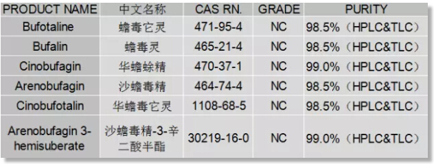 可見,鑒別藥材真?zhèn)问且患浅B闊┑氖?,而蟾酥就更麻煩了,那么多摻偽品,不對我已備好小妙招,給你們推薦了系列用于檢測蟾酥的對照品,見圖吧。