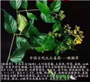 古天樂版《神雕俠侶》第27集楊服食了生長在情花旁的“斷腸草”以解情花之毒。其它一些武俠電視之中經(jīng)常出現(xiàn)“斷腸草”,而食用之后基本無藥可解,腹痛而死!更有傳說神農(nóng)氏嘗百草,最后一草就是“斷腸草”,最后神農(nóng)氏也是腹痛而死!