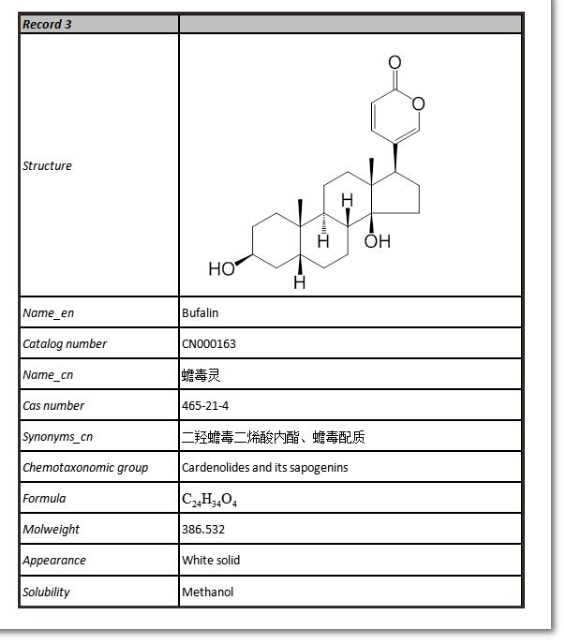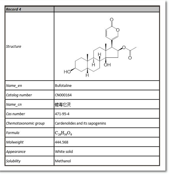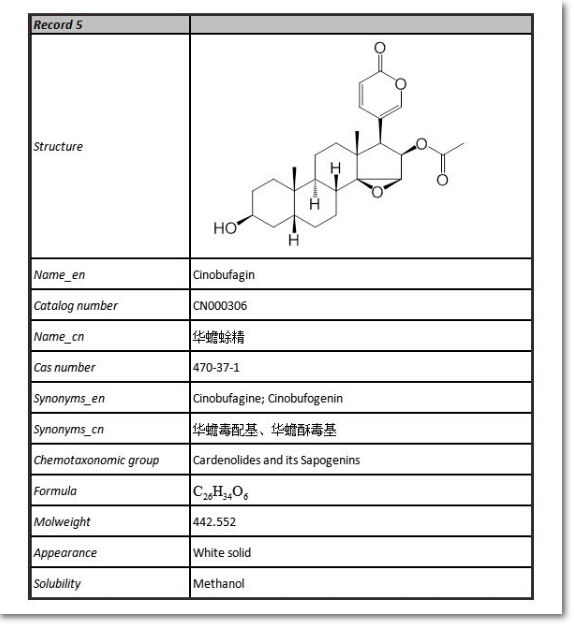 普思生物是一家專業(yè)從事天然藥物分離純化并提供藥物技術(shù)研究服務(wù)的國(guó)家高新技術(shù)企業(yè)。目前我司共有20多種蟾酥系列活性成分——酯蟾毒配基、蟾毒靈、蟾毒它靈、遠(yuǎn)華蟾蜍精、沙蟾毒精、日蟾蜍他靈、華蟾毒它靈、偽異沙蟾毒精、華蟾蜍精、去乙酰華蟾毒精、去乙酰華蟾毒它靈、南美蟾毒精、蟾蜍色胺、蟾蜍它里定、嚏根草醇、19-羥基蟾毒靈、華蟾毒精醇、酯蟾毒精、異沙蟾毒精、19-氧代華蟾毒它靈、19-氧代華蟾毒精等,部分產(chǎn)品信息如下: