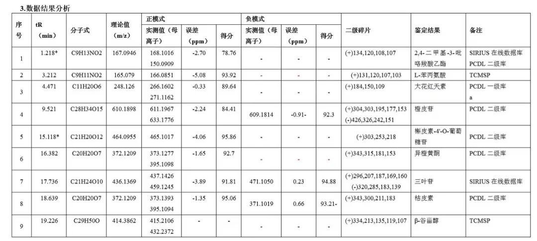 通過(guò)精確質(zhì)量、同位素豐度比、同位素精確質(zhì)量比及MS/MS四維信息關(guān)聯(lián)分析給予推測(cè)分子量、分子式,部分化合物可通過(guò)譜庫(kù)鑒定給予結(jié)構(gòu)式。