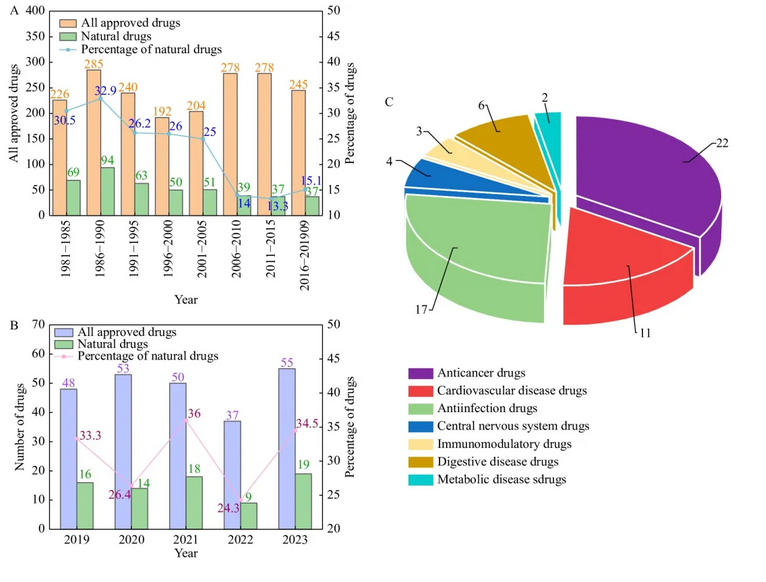 (B) 2019年至2023年FDA批準(zhǔn)的所有藥物中天然藥物的百分比