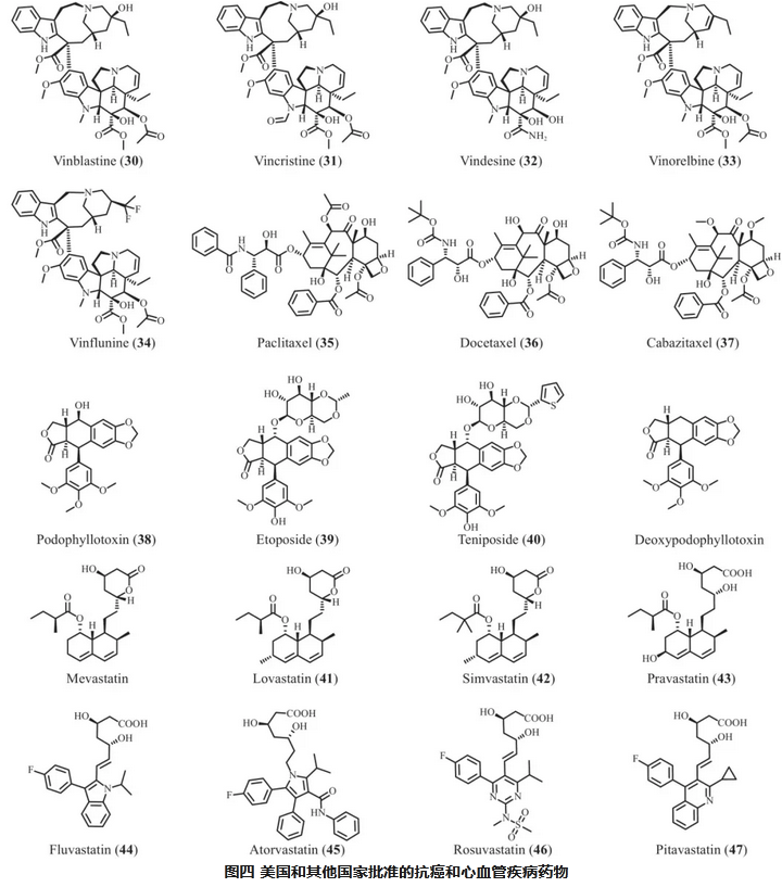 根據(jù)各種疾病的臨床治療需求,本綜述介紹了65種具有代表性的藥物,這些藥物或直接來源于天然產(chǎn)物,或來源于天然產(chǎn)物的衍生物。這些藥物已獲得國(guó)家醫(yī)藥產(chǎn)品管理局(NMDA)、美國(guó)食品藥品監(jiān)督管理局(FDA)、歐洲藥品管理局和日本藥品醫(yī)療器械管理局等監(jiān)管機(jī)構(gòu)的批準(zhǔn)。在這些藥物中,有29種是在中國(guó)開發(fā)的,其余36種是在國(guó)際上獲得批準(zhǔn)的。