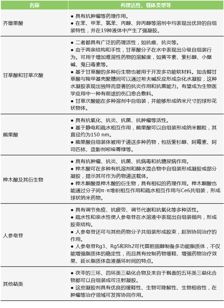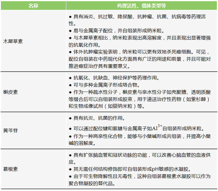(1)一些中藥活性成分具備通過自組裝形成“自遞藥系統(tǒng)”的能力,可以充分利用其自身性質(zhì)形成遞送系統(tǒng),實(shí)現(xiàn)“藥輔合一”。