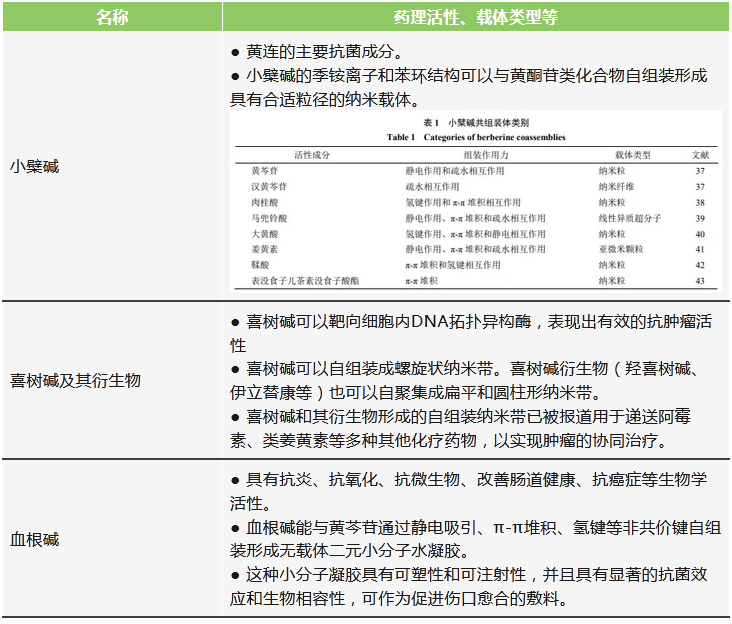 生物堿在許多中藥中廣泛存在,大多數(shù)有復(fù)雜的環(huán)狀結(jié)構(gòu),且含有N元素,呈現(xiàn)堿的性質(zhì)。生物堿是植物在應(yīng)對(duì)環(huán)境脅迫時(shí)產(chǎn)生的次生代謝產(chǎn)物,往往具有一定的毒性。在藥理方面,其表現(xiàn)為抗病毒、抗菌的活性。生物堿可以與多種中藥活性成分共組裝,以其自身作為藥物和載體作為藥物和載體,從而發(fā)揮更強(qiáng)的藥效。