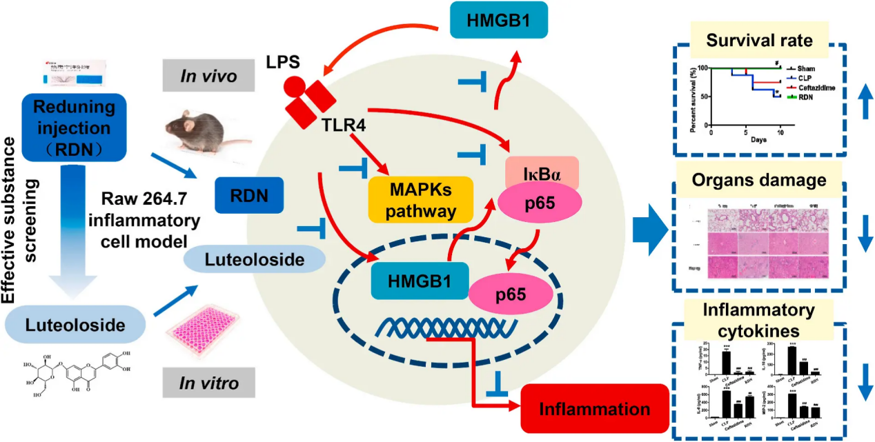 圖一 熱毒寧注射液(RDN)的核心效用成分木犀草苷的抗炎機(jī)制研究過(guò)程示意圖