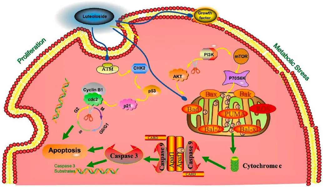 3.結(jié)直腸癌:木犀草苷通過(guò)雙重機(jī)制(線(xiàn)粒體凋亡通路激活和PI3K/AKT/mTOR通路抑制)抑制HCT116細(xì)胞增殖并誘導(dǎo)凋亡,其IC50為44.1μM,可作為功能性膳食成分或個(gè)性化營(yíng)養(yǎng)治療的潛在候選物,為結(jié)直腸癌的天然藥物開(kāi)發(fā)提供理論依據(jù)。[7]