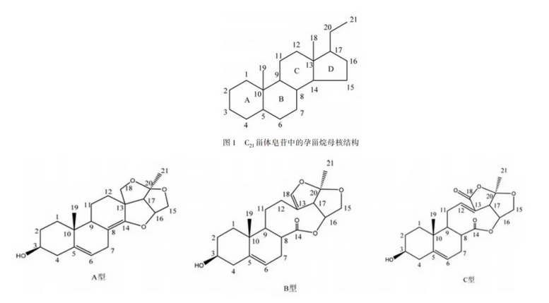 1、甾體皂苷苷元均以孕甾烷(圖1)或其異構(gòu)體為基本骨架,C、D環(huán)易發(fā)生變形,D環(huán)氧化成3個四氫呋喃環(huán)(A型)或苷元骨架中的六元C環(huán)和五元D環(huán)氧化斷裂成九元環(huán)的飽和內(nèi)酯(B型)及不飽和內(nèi)酯(C型);