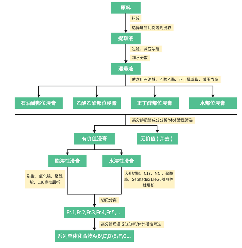 我們綜合提取、分離、色譜和質(zhì)譜分析等方法,對藥材/植物內(nèi)特征成分進行系統(tǒng)化研究,利用高分辨質(zhì)譜分析UPLC-Q-TOF及實體數(shù)據(jù)庫開展原料檢測,鎖定目標(biāo)成分,同時依托普思生物高效的分離純化平臺,能夠快速從原料中分離出稀有的、系列天然化合物。