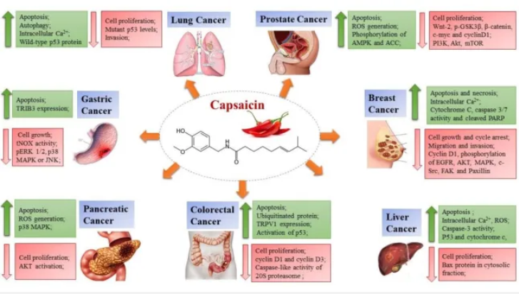 4.抗癌作用:多項研究表明,辣椒素可以調(diào)節(jié)參與癌細胞增殖、細胞周期阻滯、信號轉(zhuǎn)導(dǎo)、凋亡和轉(zhuǎn)移的基因和酶的表達水平,具有顯著的抗腫瘤活性,對胃癌、乳腺癌、肺癌、前列腺癌、結(jié)直腸癌、胰腺癌等多種類型的人類癌癥均有較強的抗癌作用(圖一)。