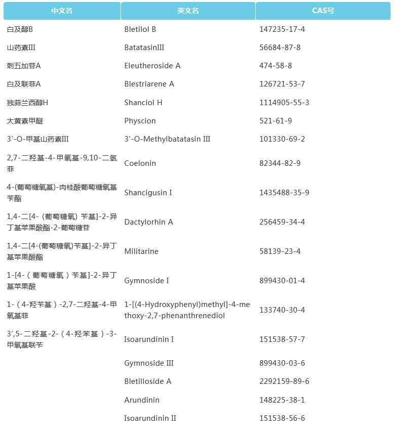 目前我司共有多種白及中聯(lián)芐類、二氫菲類、菲類、聯(lián)菲類等活性成分,針對以下重點推薦的產(chǎn)品,普思生物均現(xiàn)貨供應(yīng),當(dāng)天發(fā)貨(價格面議)。
