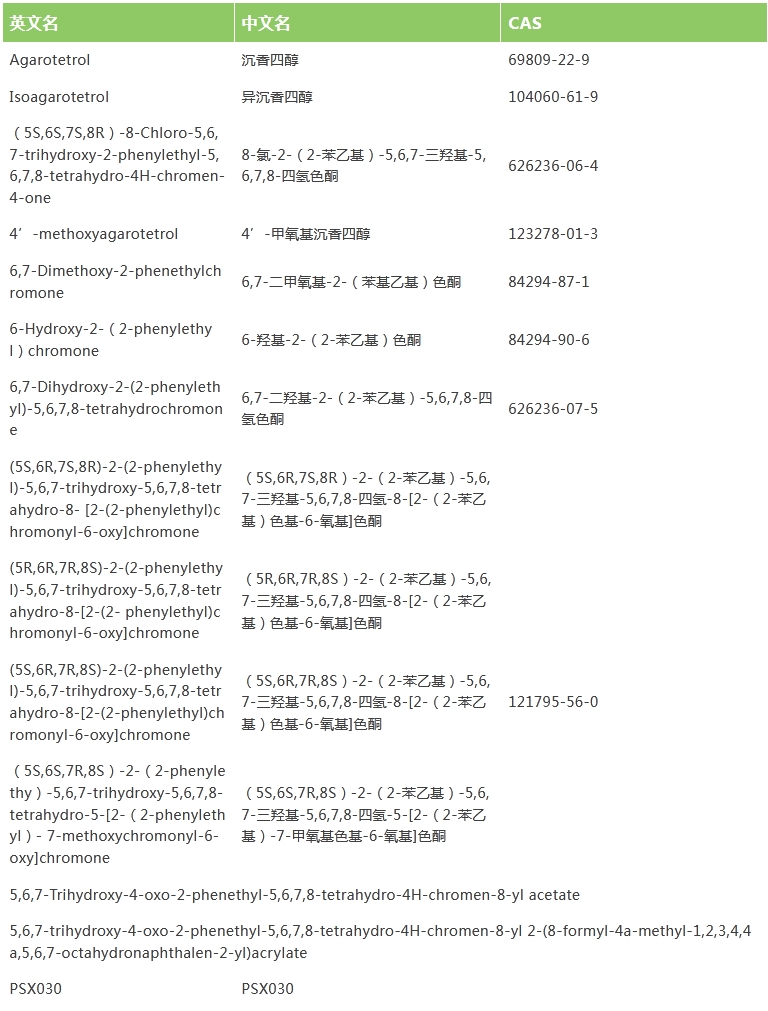 目前我司共有多種沉香色酮類活性成分,針對以下重點推薦的產(chǎn)品,普思生物均現(xiàn)貨供應,當天發(fā)貨(價格面議)。