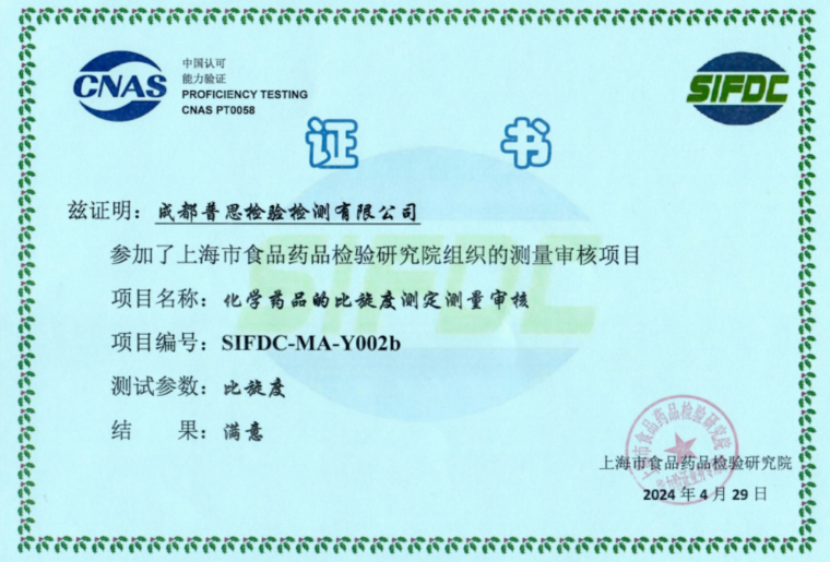 近日,成都普思生物科技股份有限公司旗下子公司“成都普思檢驗檢測有限公司”通過了由上海市食品藥品檢驗研究院于2024年組織的測量審核項目“化學(xué)藥品的比旋度測定”,結(jié)果為“滿意”。