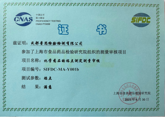 近日,成都普思生物科技股份有限公司旗下子公司“成都普思檢驗(yàn)檢測(cè)有限公司”通過了由上海市食品藥品檢驗(yàn)研究院于2025年組織的測(cè)量審核項(xiàng)目“化學(xué)藥品的熔點(diǎn)測(cè)定”,結(jié)果為“滿意”。