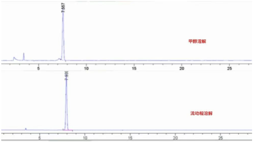 原因:對照品在溶劑中發(fā)生了降解,降解產(chǎn)物可能與主成分共洗脫,導致峰形拖尾、展寬。