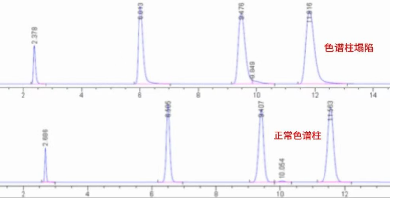 原因:長期使用后的色譜柱可能出現(xiàn)填料塌陷、污染等問題,導致固定相吸附點位不均勻,從而影響對照品的保留和分離,產(chǎn)生拖尾或前沿峰。