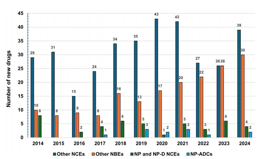 · 抗癌藥物:含米哚妥林等首創(chuàng)藥物,異補骨脂素源自中藥獲批用于肝癌;NP-ADCs 表現(xiàn)突出,2014-2024 年獲批 12 種,彈頭多來自天然產(chǎn)物,通過靶向遞送提升療效、降低毒性。