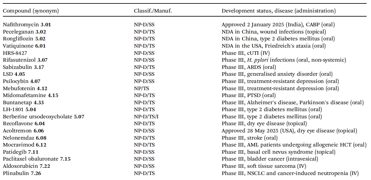 天然產(chǎn)物(NPs)是藥物研發(fā)的傳統(tǒng)基石,從古代草藥到嗎啡、奎寧等經(jīng)典藥物,應用貫穿醫(yī)學發(fā)展史,20 世紀中葉迎來抗生素研發(fā) “黃金時代”。但 20 世紀后期,合成化學、分子生物學技術(shù)興起及生物制劑崛起,使其核心地位有所下降,但依然是多元研發(fā)手段之一。本文基于 2014 年 1 月至 2025 年 6 月全球藥物審批數(shù)據(jù)及截至 2024 年底的臨床試驗信息,系統(tǒng)分析天然產(chǎn)物衍生(NP-D)藥物的發(fā)展態(tài)勢。文中明確天然產(chǎn)物為海洋、陸地植物、微生物等來源的純小分子化合物(萜類、聚酮類等),排除初級代謝或營養(yǎng)功能分子;相關(guān)化合物分為 NP(天然產(chǎn)物)、NP-D(天然產(chǎn)物衍生)、NP-ADC(NP-抗體偶聯(lián)藥) 三類,制造方式含天然分離、半合成、全合成。